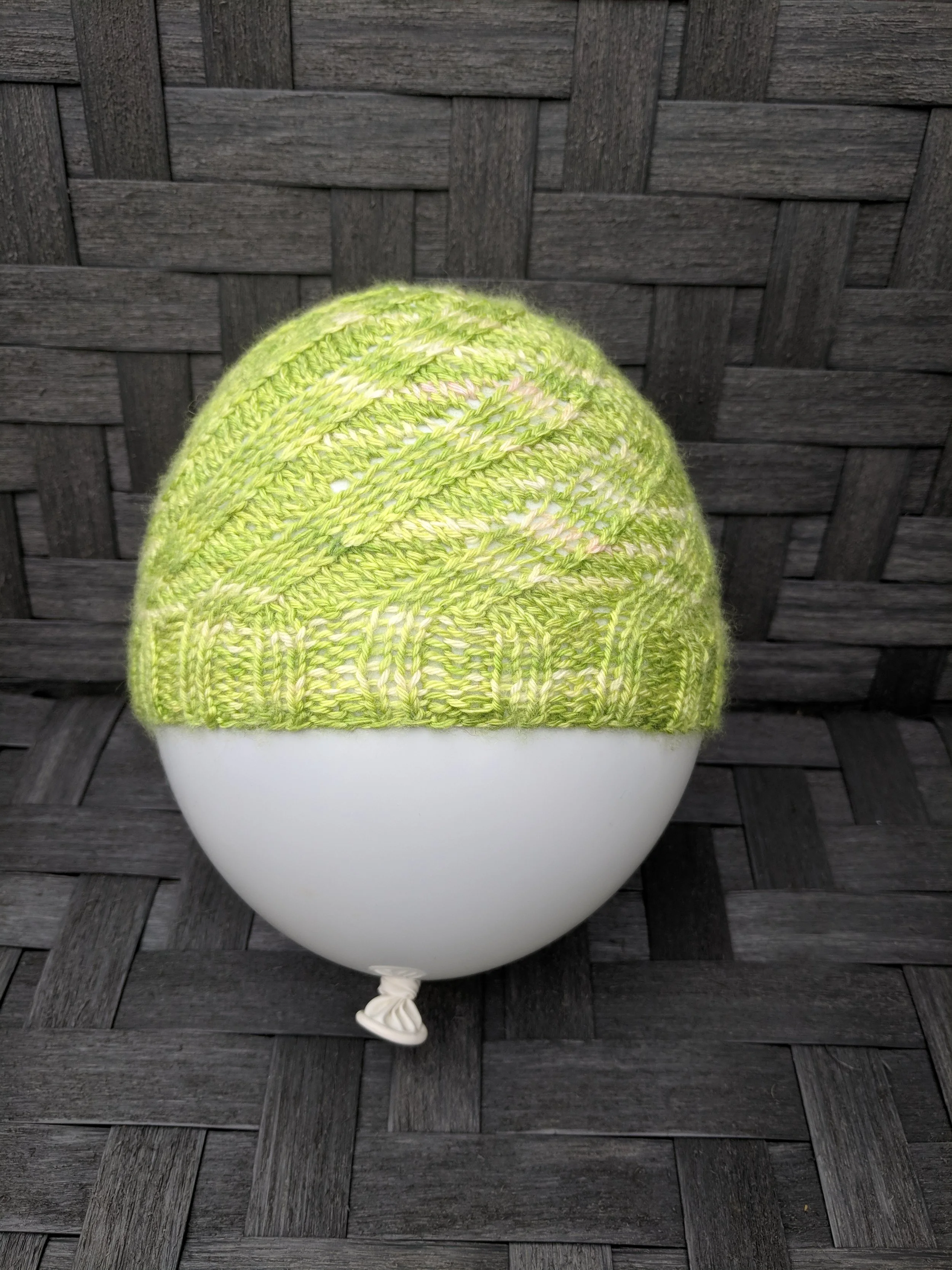 I needed to block this hat a bit to bring the swirls to life, and the balloon was a great idea that I borrowed from someone else. It worked liked a charm, but I blew it up too big so it overstretched the band a bit. There’s not much sproing to this yarn – surprising for a sock yarn – so when it stretched it stayed stretched. That would be the one thing I would like a redo on. Oh well, live and learn.